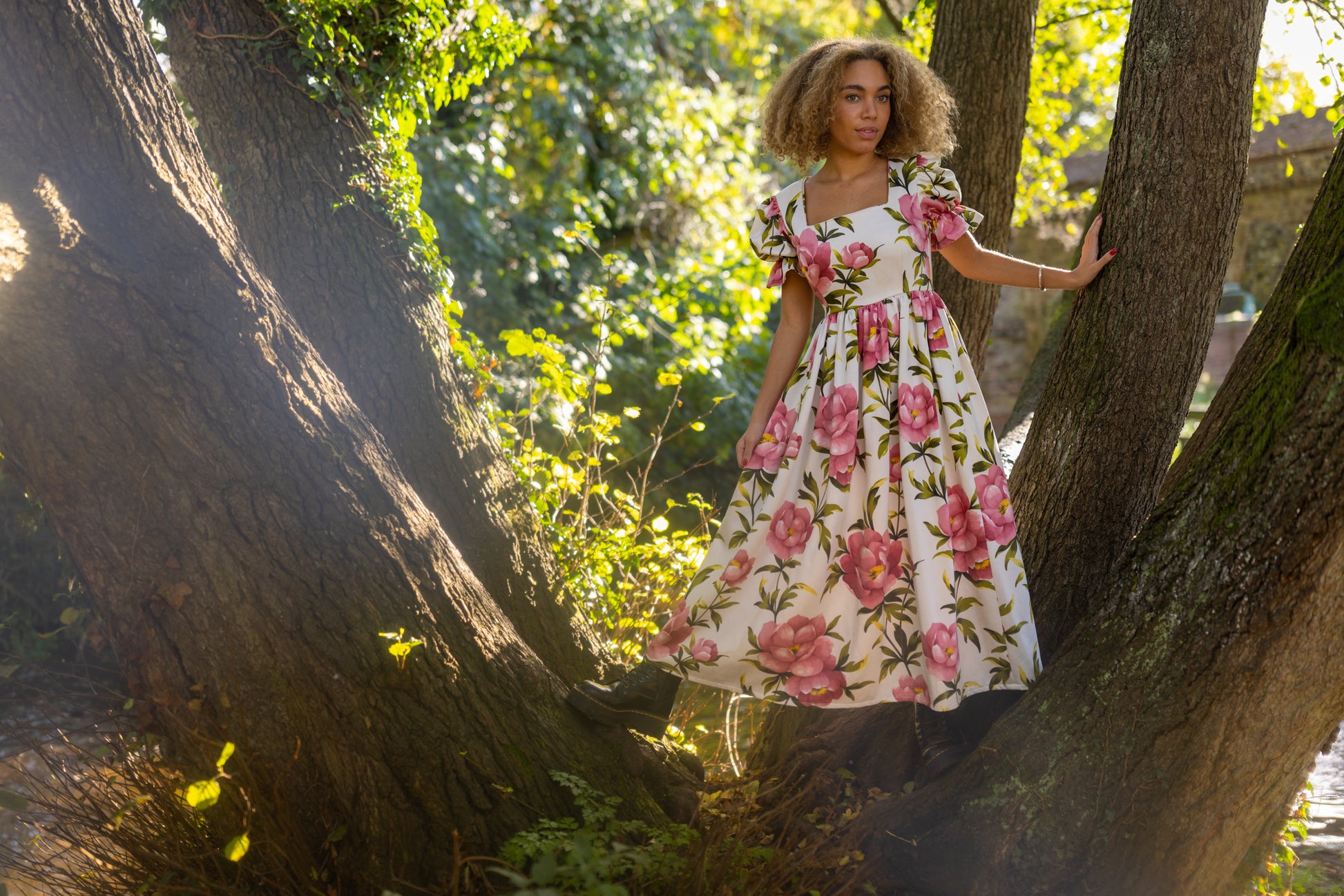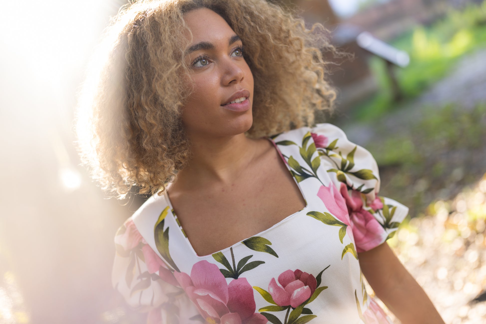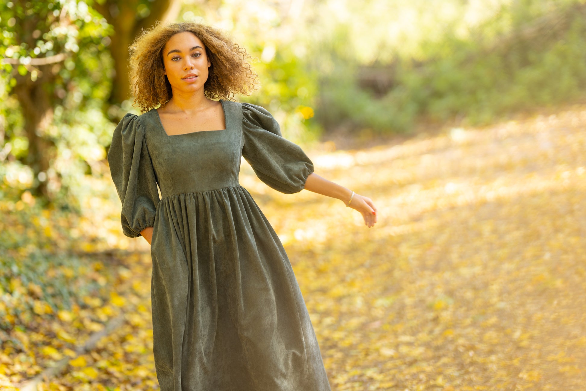 Floaty 70s inspired dress with a square neckline and higher waistline