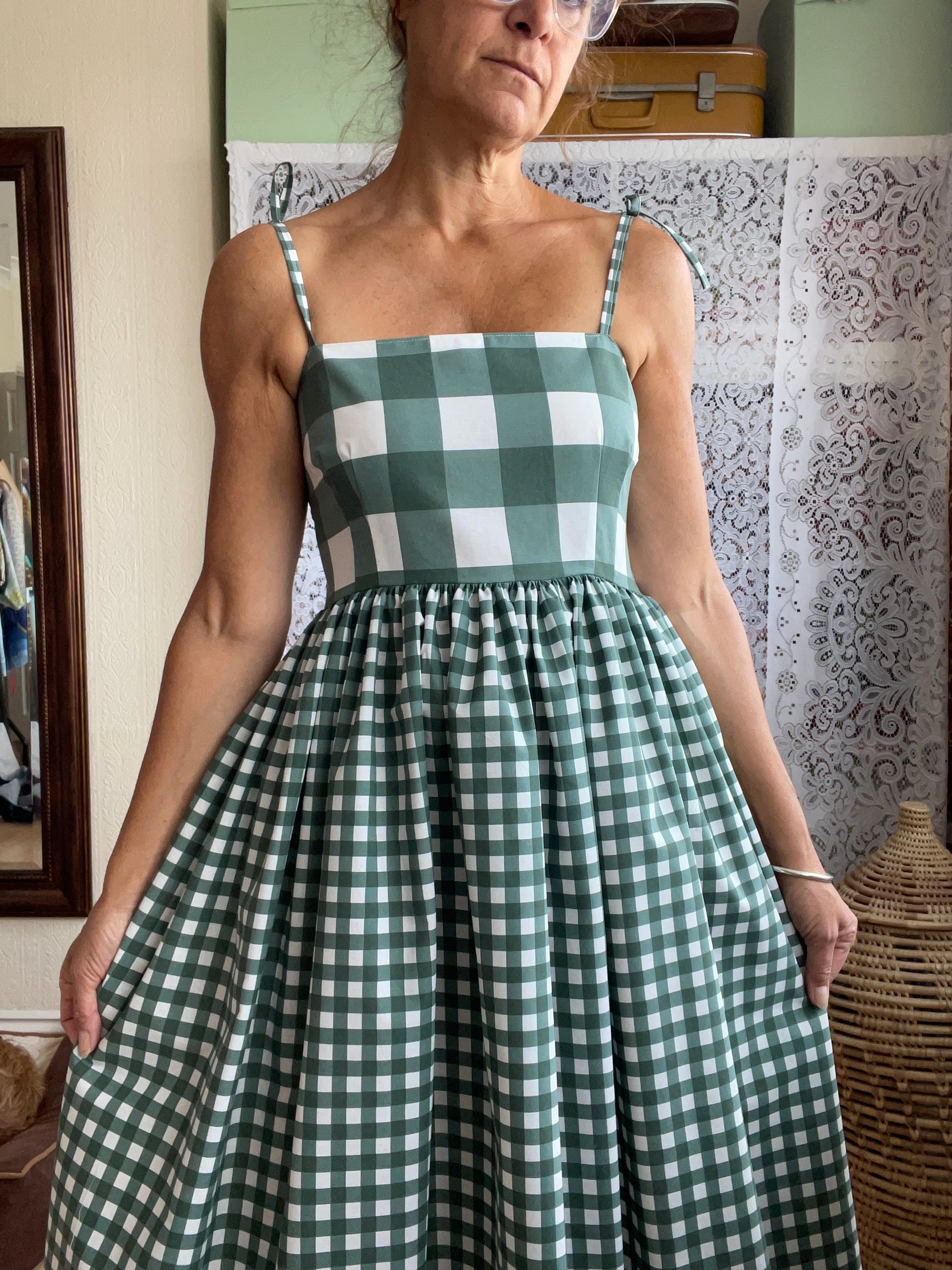 All fabrics are sourced by us and are mainly preloved or vintage as it's important to us to keep Lofty Frocks as sustainable as possible and not to create a negative impact on landfill.