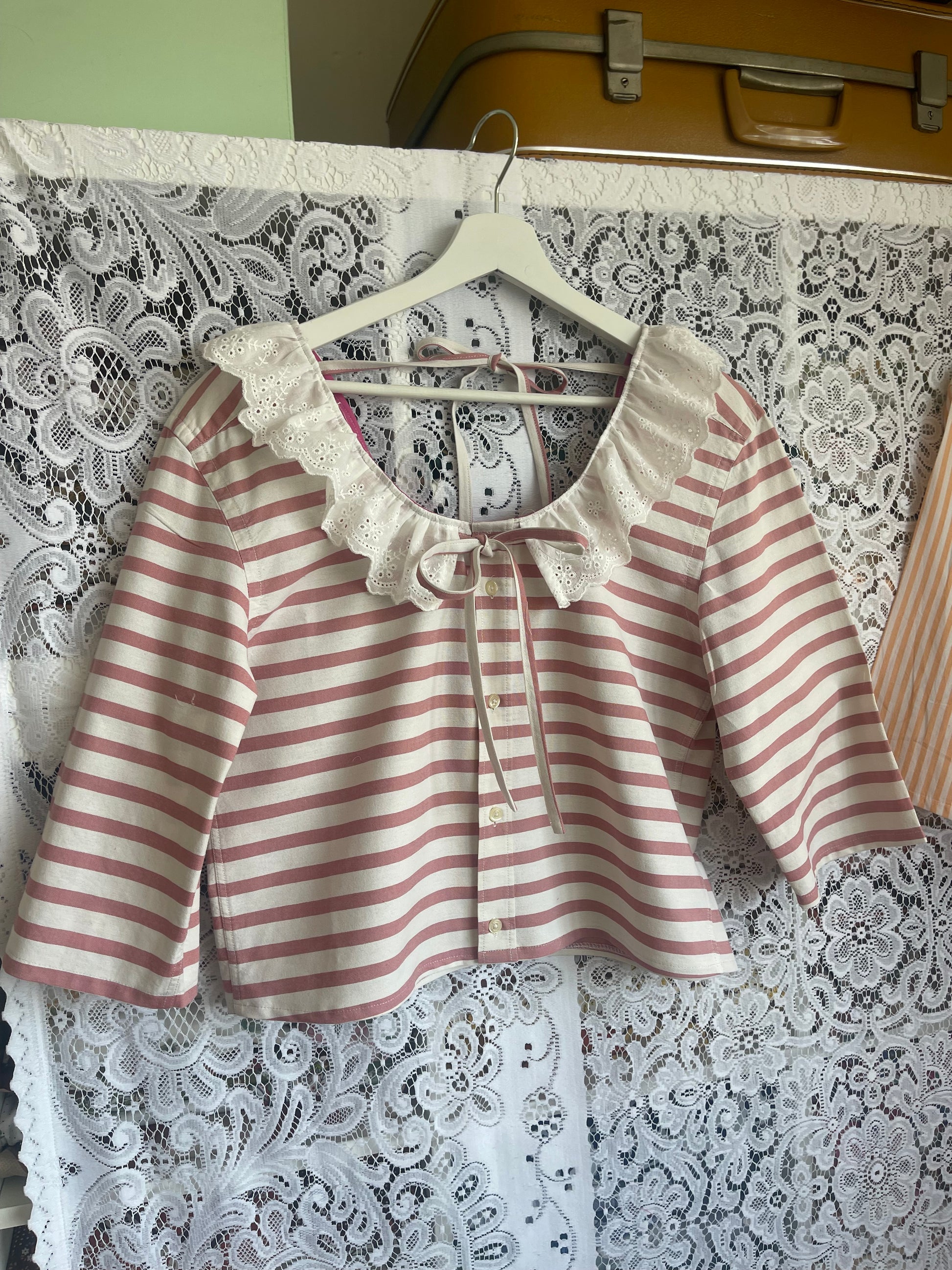 - Button front with lace trim collar