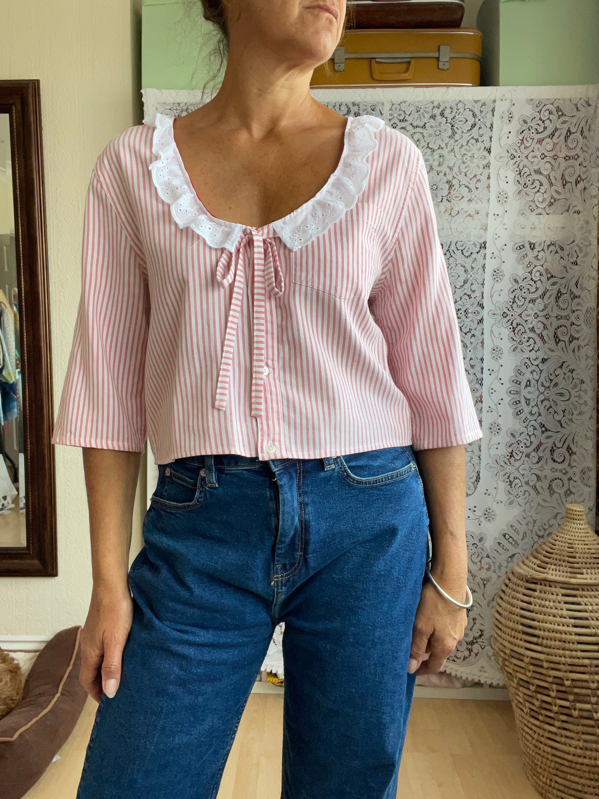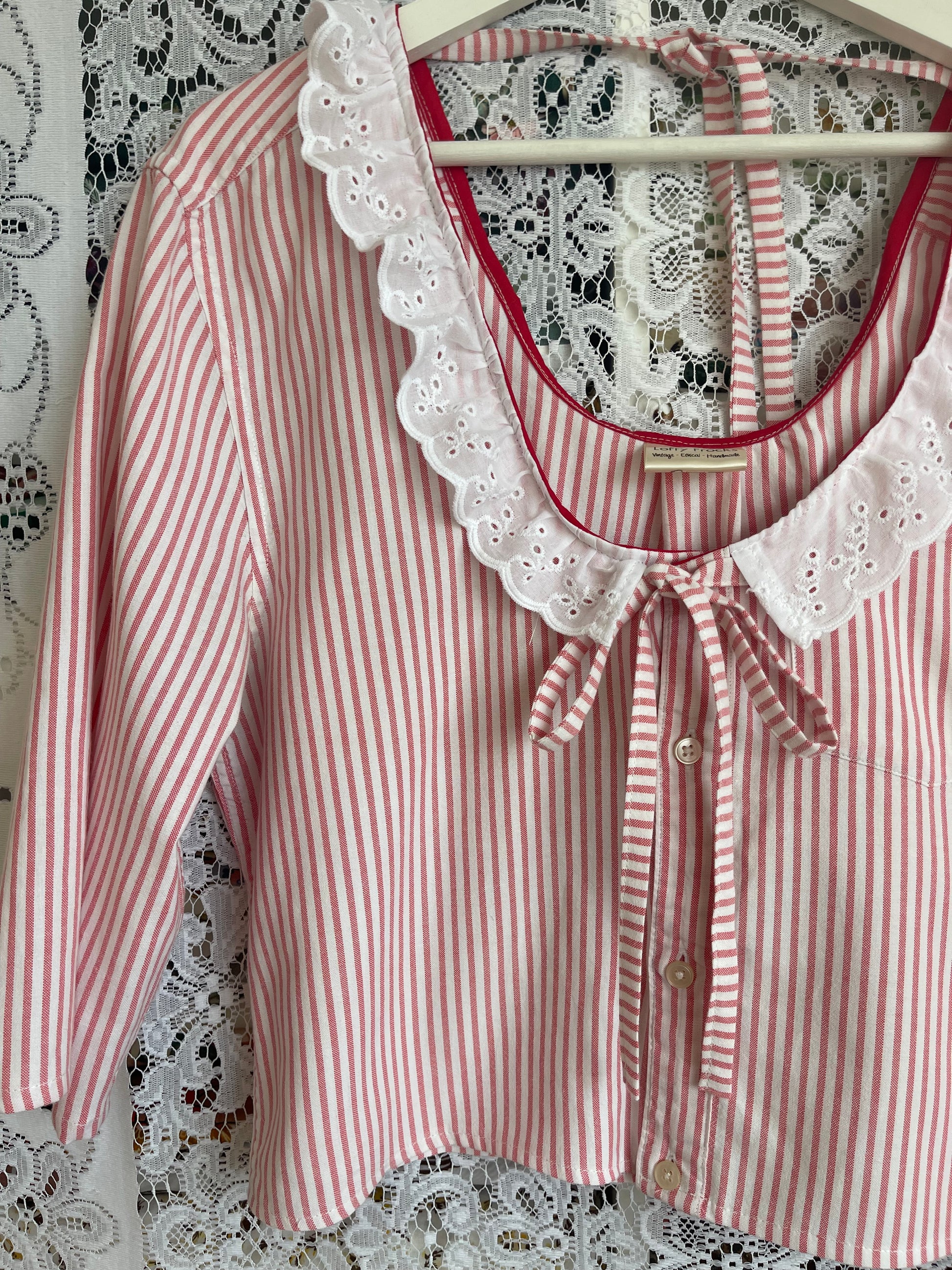 - Button front with lace trim collar